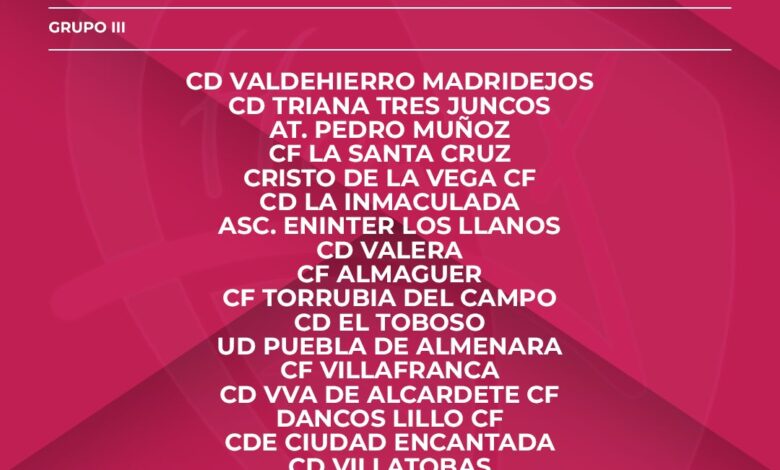 Por su parte, el Grupo III reunirá a la mayor parte de representantes comarcales: CD Triana Tresjuncos, Atlético Pedro Muñoz, CD Los Llanos, CD El Toboso, CF La Santa Cruz de La Alberca de Záncara y Cristo de La Vega de Socuéllamos.